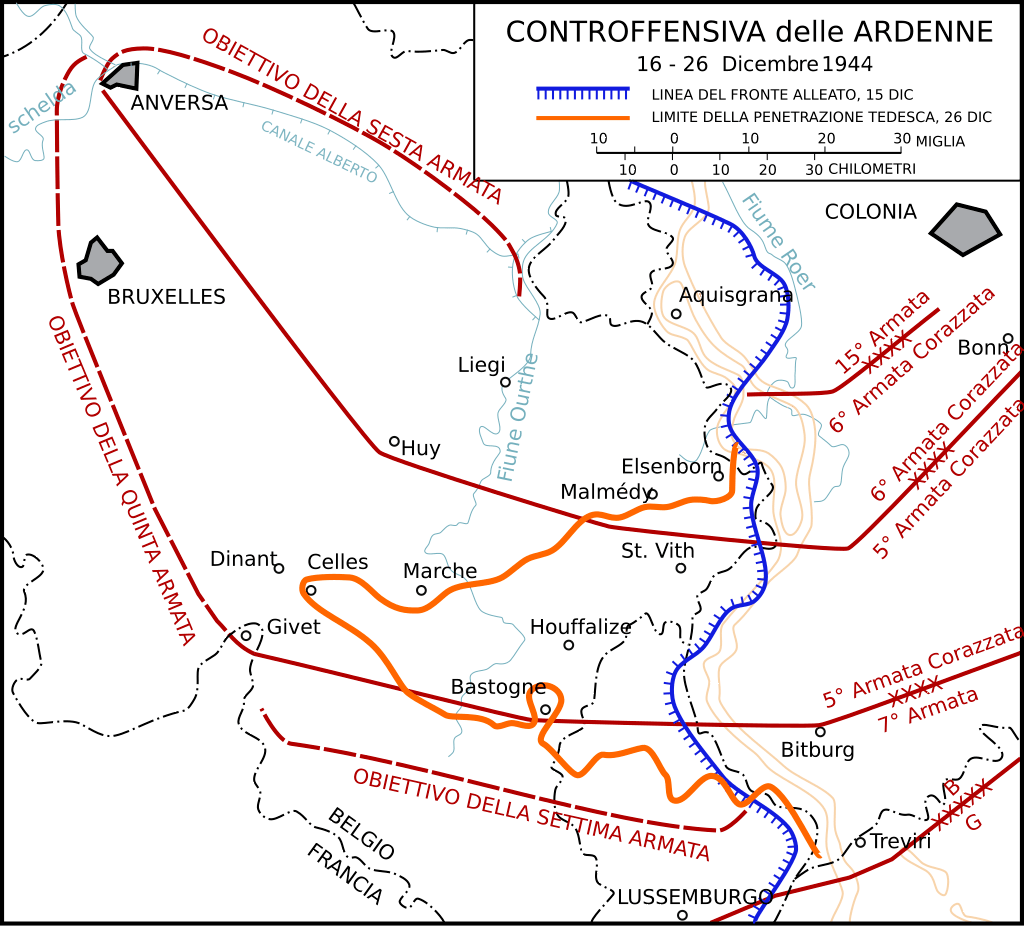 A metà dicembre 1944 l’esercito tedesco lanciò improvvisamente un’offensiva partendo dalle proprie posizioni nelle Ardenne, da cui quattro anni prima la Wehrmacht aveva lanciato la propria vittoriosa offensiva che aveva portato al crollo della Francia. Favorite dall’effetto sorpresa – gli Alleati non si aspettavano un’offensiva – e dal maltempo, che impedì, almeno temporaneamente, agli anglo-americani di far valere la propria schiacciante superiorità aerea, le unità tedesche poterono avanzare di diverse decine di chilometri in territorio belga.